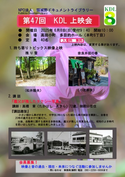 第47回上映会を令和7年06月08日(日)に開催します。会場の都合で定員40名ですので、参加ご希望の方は事務局(藤野) 電話090-2259-9006にお問い合わせください。